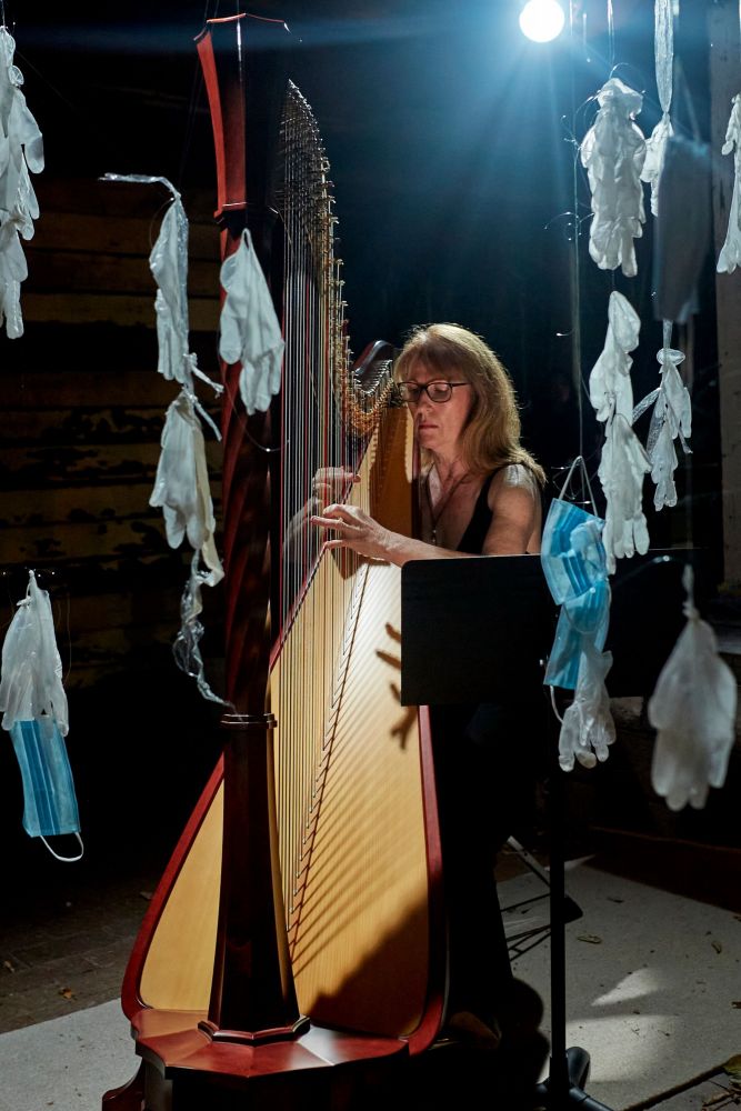 The individual sketches included a few short one-idea pieces, including a monologue by Robert Gibson about the loneliness and meaninglessness of life in lockdown (Every day is Sunday), a dance piece about its physically cramped enforced domesticity called Respire, and an exquisite harp solo, played behind plexiglass by Alicia Dawes-Salazar. The one I found the most touching was a performance of the Flower Duet from Lakme, which honoured the response to the lockdown in some Italian towns, where people sang from their balconies. It was beautifully sung by Emma Graves and Joanne Connor, appropriately, from the balcony above the Italian Diner.