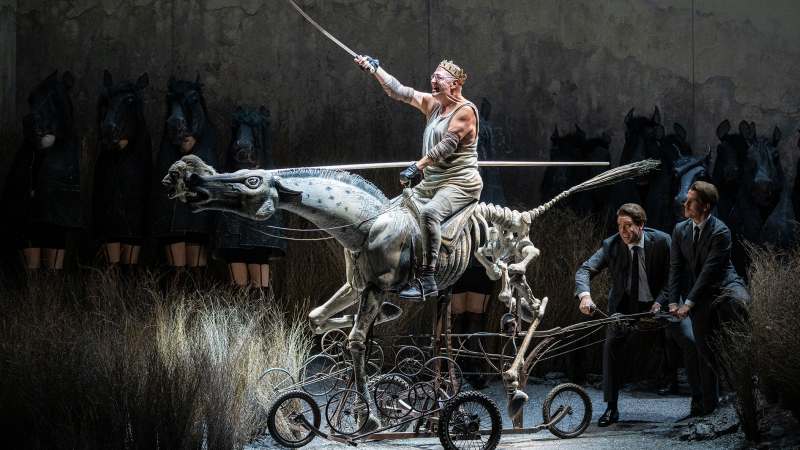 In the first act Tsar Dodon, who only wants a peaceful retirement, feels threatened by the preparations for war by the Tsarina of “Chemaka”. Pavlo Hunka, who is used to playing buffoon roles commonly allocated by composers to bass-baritones, blends fear with comedy in his reception of the conflicting advice given him by his two sons. Dodon, like Putin, is supposed to be a chess player, (though he can’t be a very good one) and so the chorus of soldiers wear horse heads not only to represent cavalry but also chess knights. Barry Kosky, who directs the production, could be relied upon not to miss that opportunity. It was so striking that I had to look nervously round to see whether anyone in the audience had a Covid mask with a representation of a horse on it.