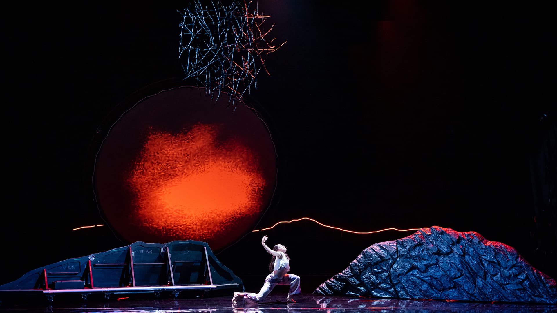 A circular hanging screen (by Matthew Adey) projects pixelated images of bones, anatomy and rock-like patterns that suggest both nature and science. To a busy and everchanging orchestral score by Deborah Cheetham Fraillon, The Hum sometimes feels driven more musically than physically, progressing forth with a swelling cinematic intensity and a sprawling visual narrative.