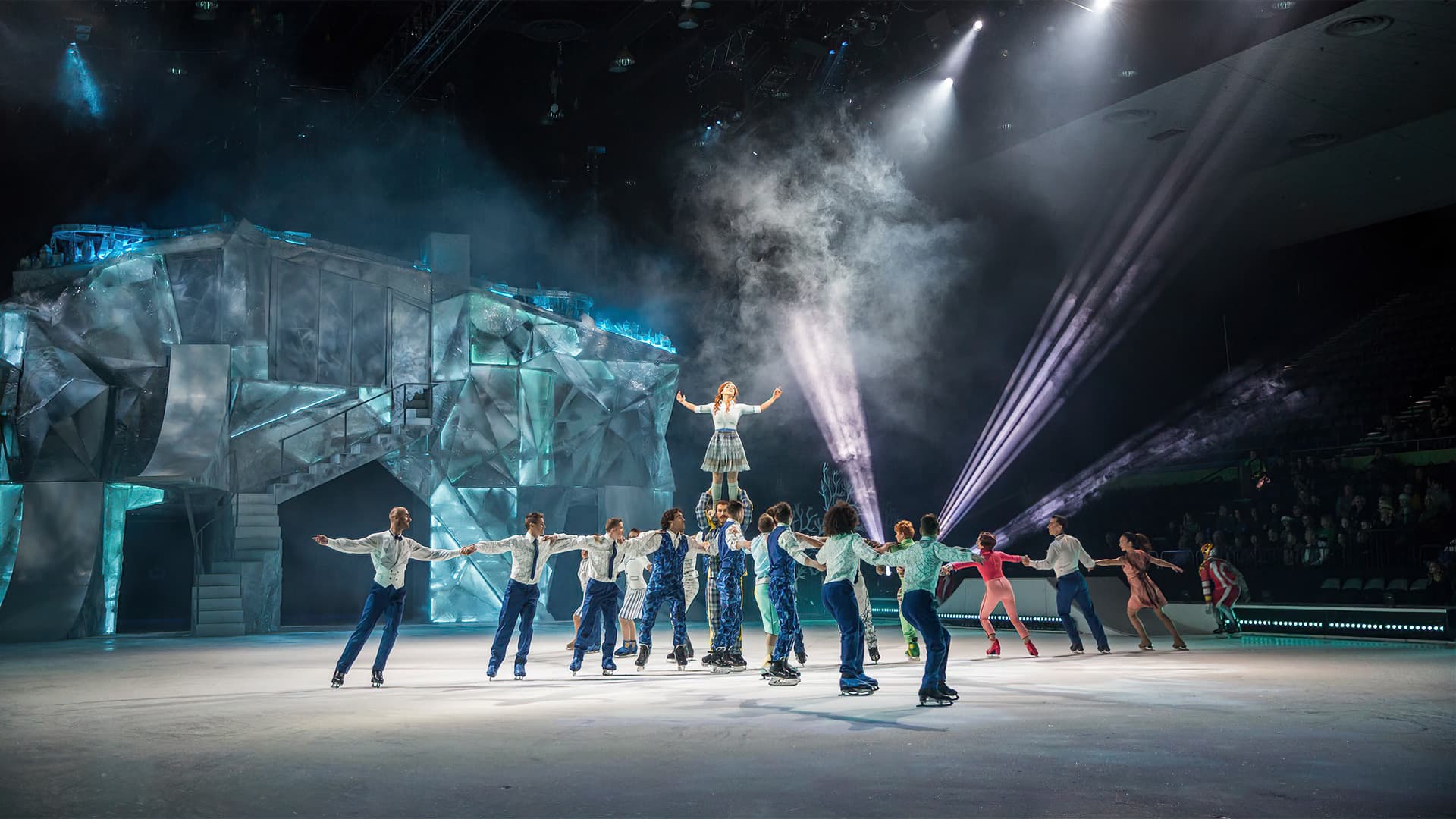 Despite this, Crystal harbours some really great moments, especially in Act 2, when circus acts like duets on aerial straps and trapeze unfold from super high rigs and are executed with the top shelf skill you would expect from best-in-the-biz acrobats. A group swing poles routine has human flags flying in sync many, many metres above ground. An ice hockey scenario evolves into a wild obstacle course of daredevil skaters flipping and flying over skateboarding-like ramps, ending Act 1 with the pow that it was previously missing.