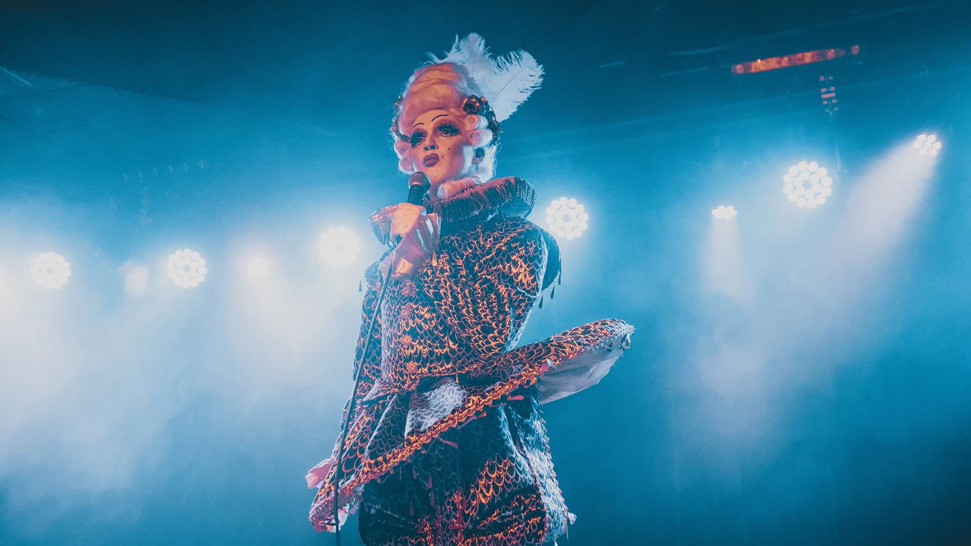The show was a whimsical drag concoction which transported the audience to the 17th century. Beautifully clad in a courtly ensemble of satin and lace, exquisitely made up and sporting a fabulous, towering wig, Adore beguiled the audience with anecdotes from his little black book.